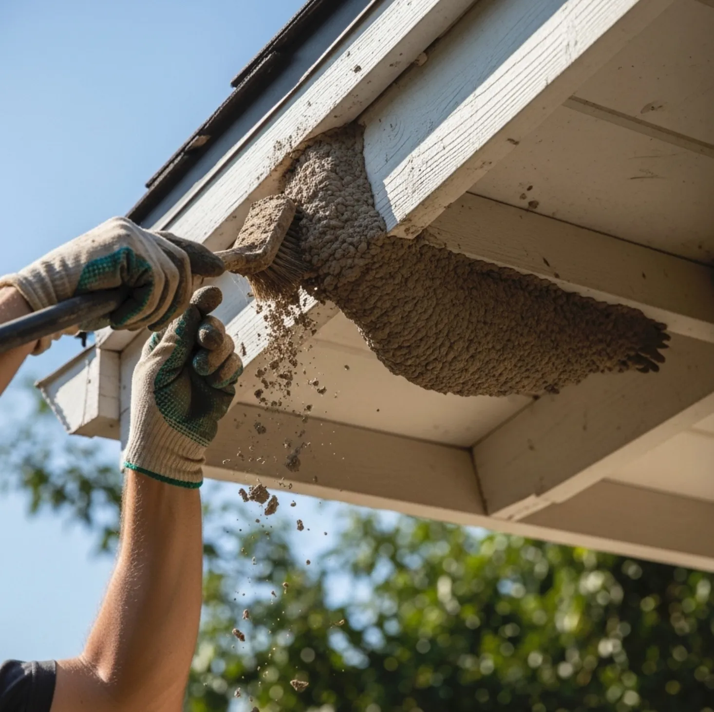 We knock down accessible paper wasp nests on the first floor eaves to prevent stings near your doorways.